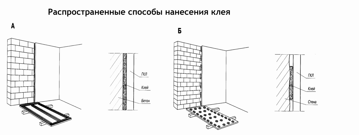 Бескаркасный способ крепления ГКЛ к стене позволяет монтировать его на различные типы поверхностей: