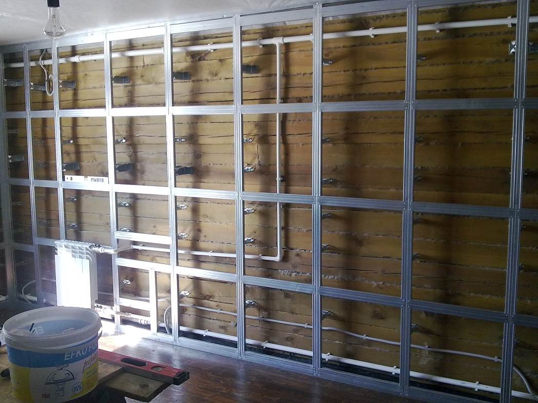 Второй вариант более универсальный. Собирая каркас, формируется новая плоскость. Стена же используется только как опора. У этого способа есть свой недостаток – он скрадывает от габаритных размеров комнаты минимум 4 см.