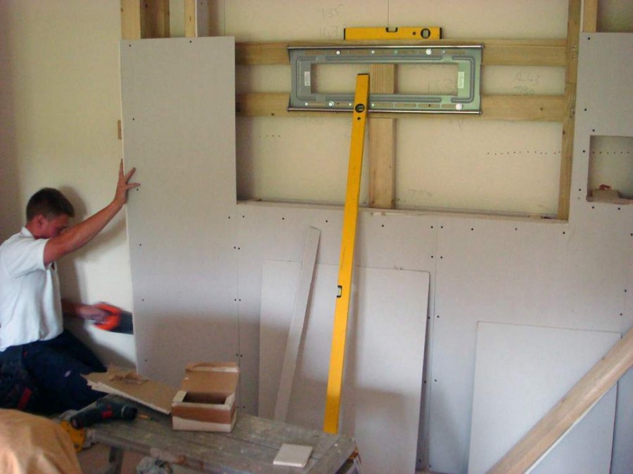 Как только закончен монтаж ГКЛ, остается заделать швы и прошпаклевать поверхность.