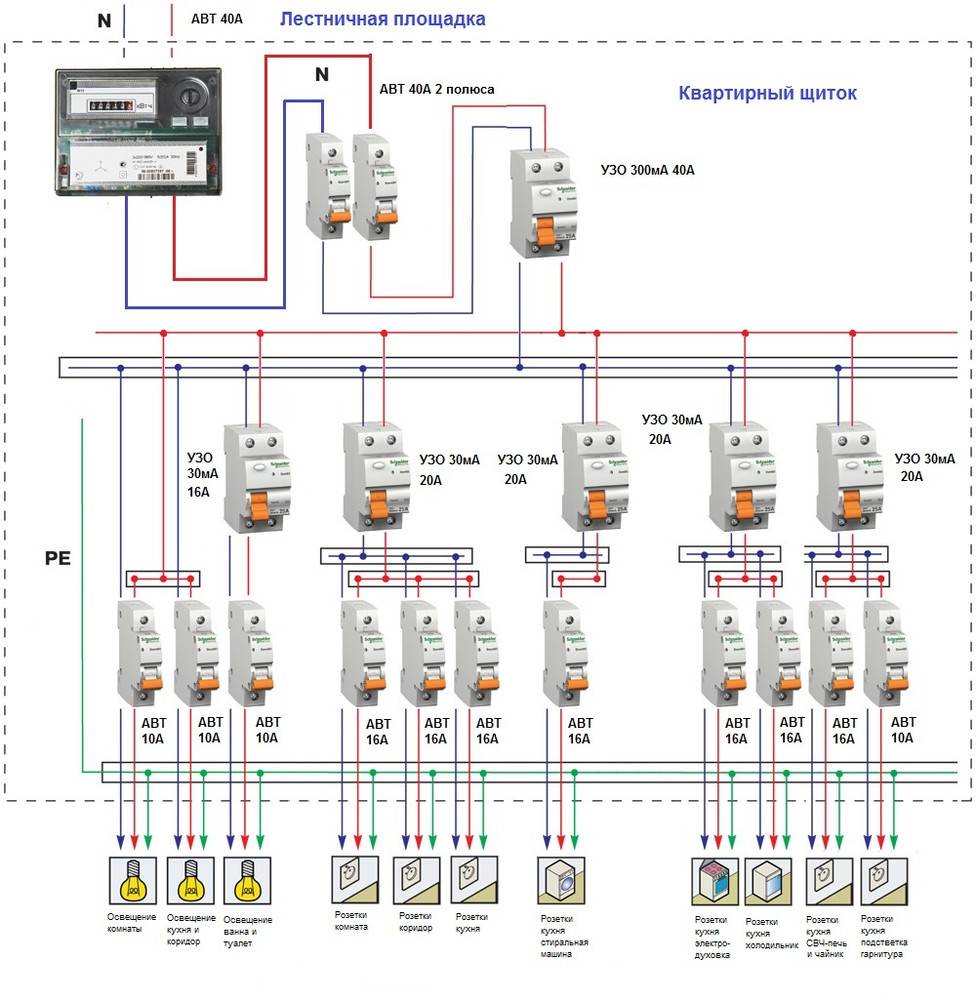 Таким образом, у нас получается схема, в которой питание всей нагрузки квартиры разбито на групповые линии. Такие как, группа освещения, группа бытовых розеток, группы силовых розеток.
