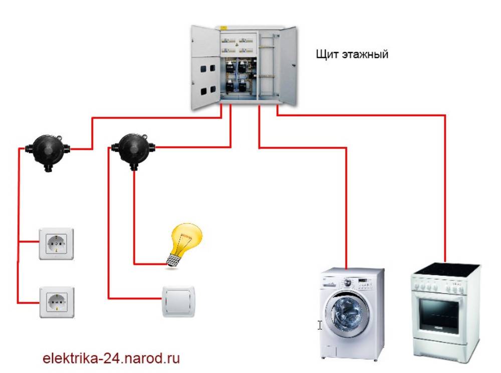На остальные розетки в квартире можно пробросить общий кабель до распределительной коробки, а от нее уже выполнить разводку кабелем на каждую розетку или блок розеток. С освещением поступим так же, на коробку бросим общий провод, а от коробки сделаем разводку к светильникам и выключателям.