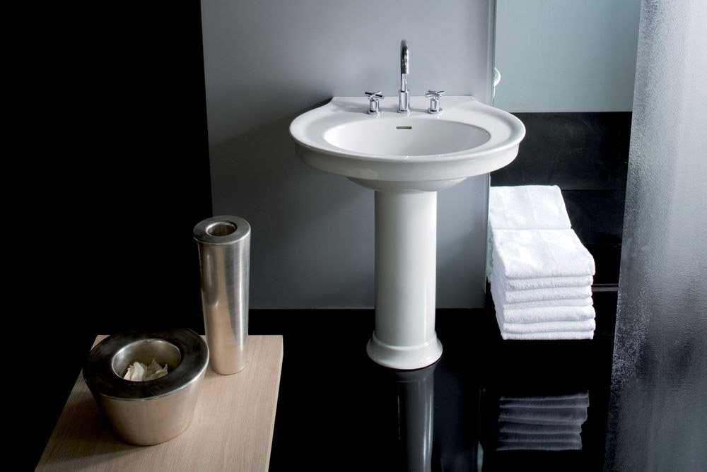 - На пьедестале. Монтаж раковины осуществляют непосредственно к стене с использованием кронштейнов, но в отличие от подвесного варианта системы коммуникации скрыты под специальной конструкцией – пьедесталом. Бывают аксессуары с частичным и полным пьедесталом, единственным их минусом считается ограничение в высоте, которая не может превышать 80 см.