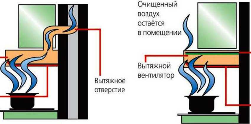 Сравнительные схемы работы вытяжки с отводом в вентиляцию и рециркуляционной.