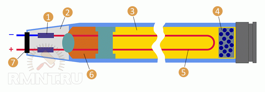 Строение X-L PIPE: 1 — холодный конец кабеля; 2 — изоляционный материал; 3 — теплопроводящая жидкость; 4 — устройство поглащения напряжения; 5 — 7 натянутых хромоникелевых нитей с двойным покрытием; 6 — пробка из силиконовой резины; 7 — силиконовая крышка