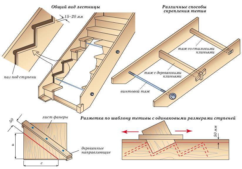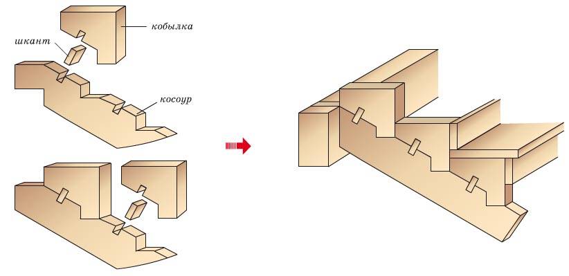 При большом опыте обращения с деревом и навыке пользования столярным инструментов трудностей при сборке лестницы не возникнет. Монтаж конструкций с забежными ступенями на косоурах проводят в следующей последовательности: