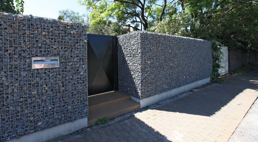 Если вы решили сделать забор из габионов своими руками, имейте в виду, что подобные конструкции из-за значительного веса не подходят для изготовления ворот и калиток. Между тем подобрать для таких заборов элементы входных групп соответствующего дизайна не составит больших проблем, так как они хорошо интегрируются с воротами и калитками, в оформлении которых использованы художественная ковка и обычный металлопрокат.