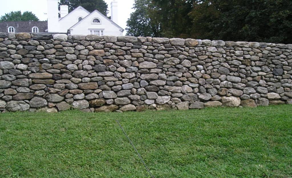 - Булыжник — самый распространенный вид камня, используемый для возведения оград. Подручный материал подкупает своей распространенностью практически повсеместно. Для кладки используют экземпляры, имеющие плоскую поверхность одной из сторон, либо его распиливают или раскалывают на несколько частей.