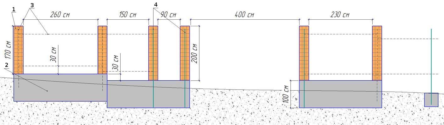 Чтобы забор получился прочным, необходимо предусмотреть кирпичные столбы-колонны через равные промежутки кладки, во всех углах, местах установки ворот и калиток.
