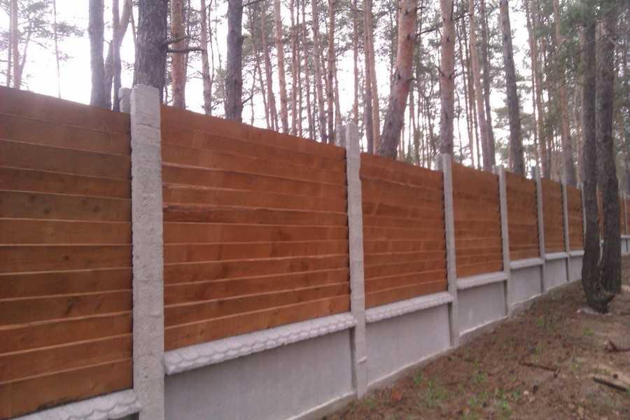 - заборы из кирпича с деревянными частями. На ленточном фундаменте располагают секции из евроштакетника, из профнастила;