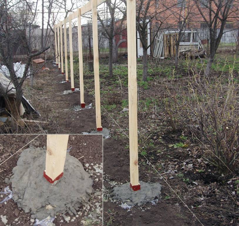Нижний ряд на расстоянии 30-35 см от земли, второй — на 20-25 см ниже верхнего края опоры. Места соединений для защиты от коррозии тщательно прогрунтовывают и красят в два слоя.