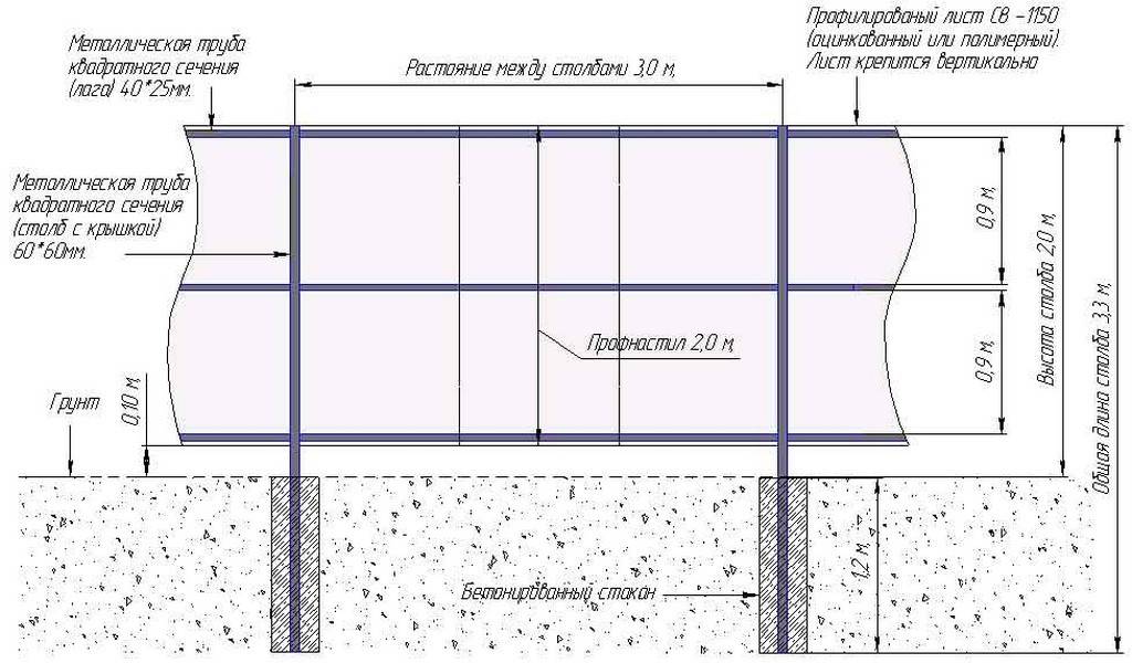 Чертёж конструкции забора из профлиста с металлическими столбами