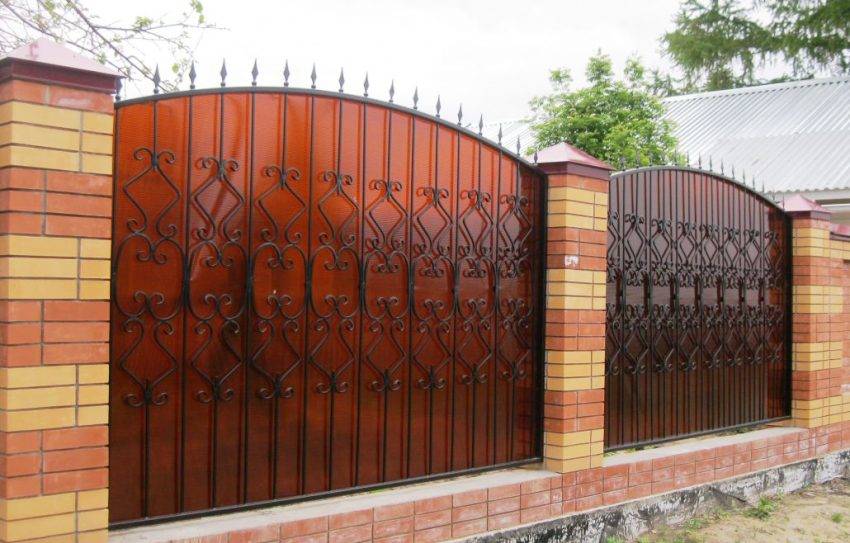 Еще один плюс этого стройматериала – многообразие оттенков. В случае необходимости можно подобрать максимально подходящую расцветку для комбинации с металлическим каркасом или кирпичом. Наиболее презентабельно смотрится сочетание ПКБ с кованым забором. Ковка с поликарбонатом требует достаточно большого расхода средств, однако не только радует глаз, но и является очень долговечной конструкцией.