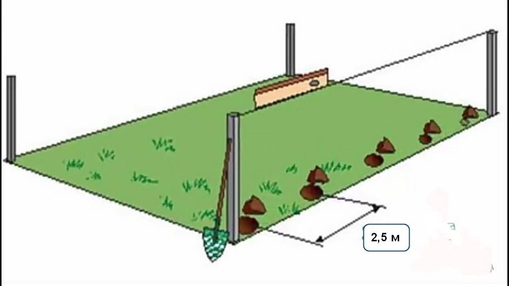 От угла отступают вдоль разметки 2,5 м и тоже устанавливают маячок, а затем точно так же определяют места расположения всех несущих опор. С помощью садового бура на месте колышков роют ямы под столбы диаметром не более 20 см. Глубина ям зависит от высоты столбов и плотности грунта, в среднем она составляет 1,2 м.