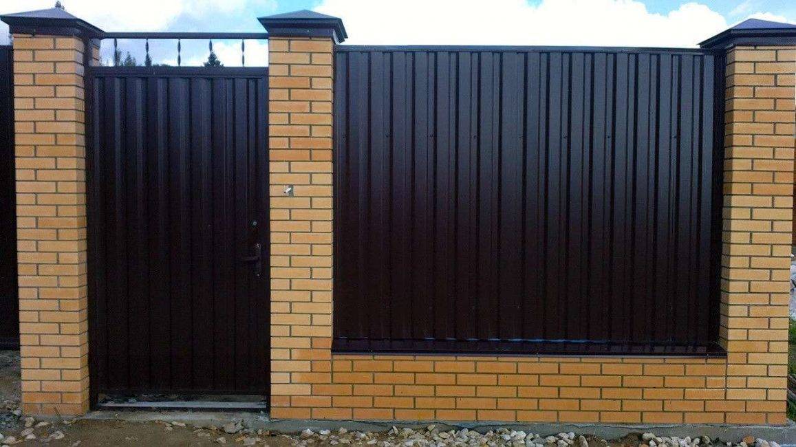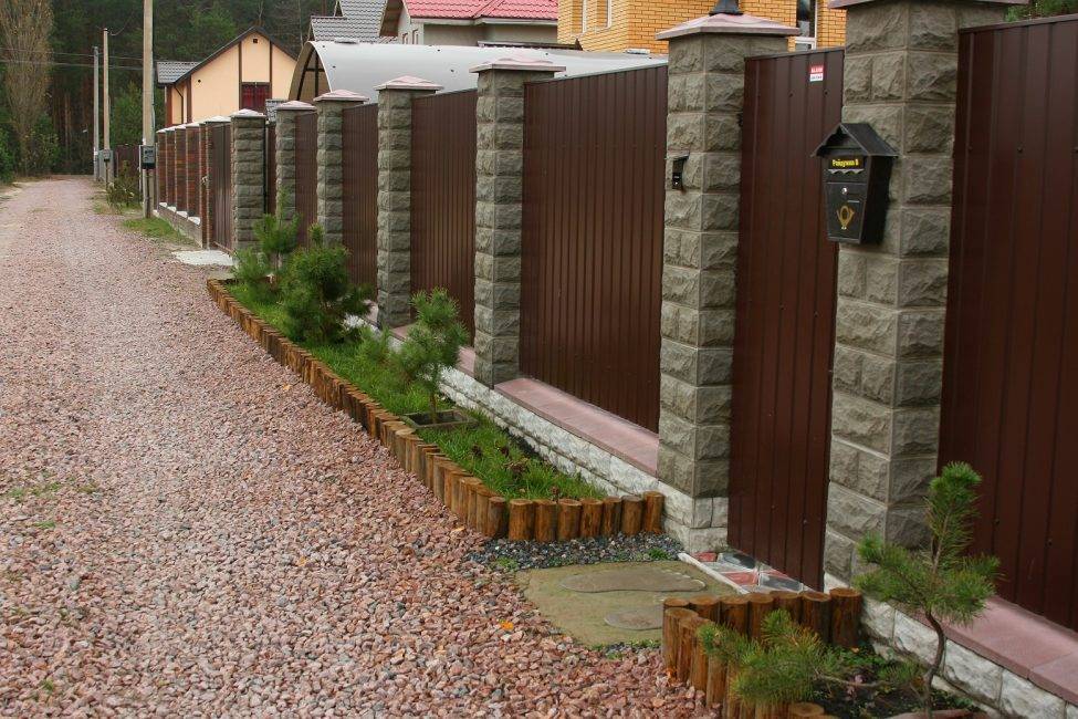 - профлист прекрасно сочетается с кирпичными или каменными столбиками, декоративными решетками из профтрубы, декоративным ленточным фундаментом.