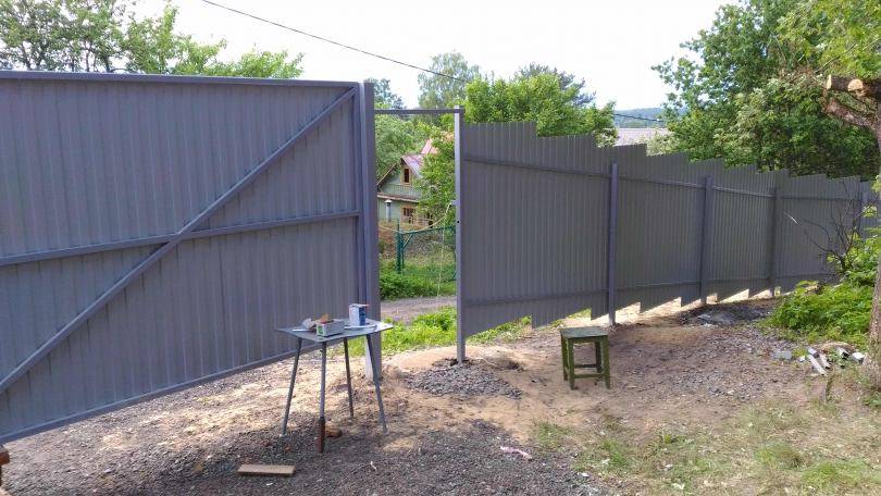 Самое сложное в этом деле – закрепление ворот и калитки. Сначала нужно сделать жесткий каркас, который будет достаточно прочным, и лишь потом рабочие могут начать фиксацию самих листов. Если вам так удобнее, можете сразу закрепить профнастил, а потом наложить его на каркас, чтобы не зашивать по одному листу.