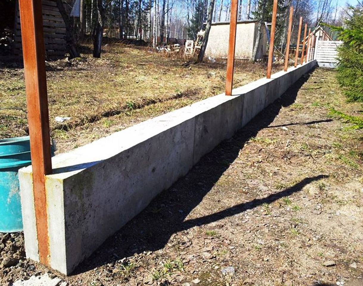Ограждение на фундаменте обладает повышенной надежностью. Такой каркас способствует наибольшей ветроустойчивости. Ленточный фундамент заливается бетоном по всей протяженности ограждения, при этом используется арматура и опалубки. На финальном этапе выполняется облицовка фундамента кирпичом или камнем.