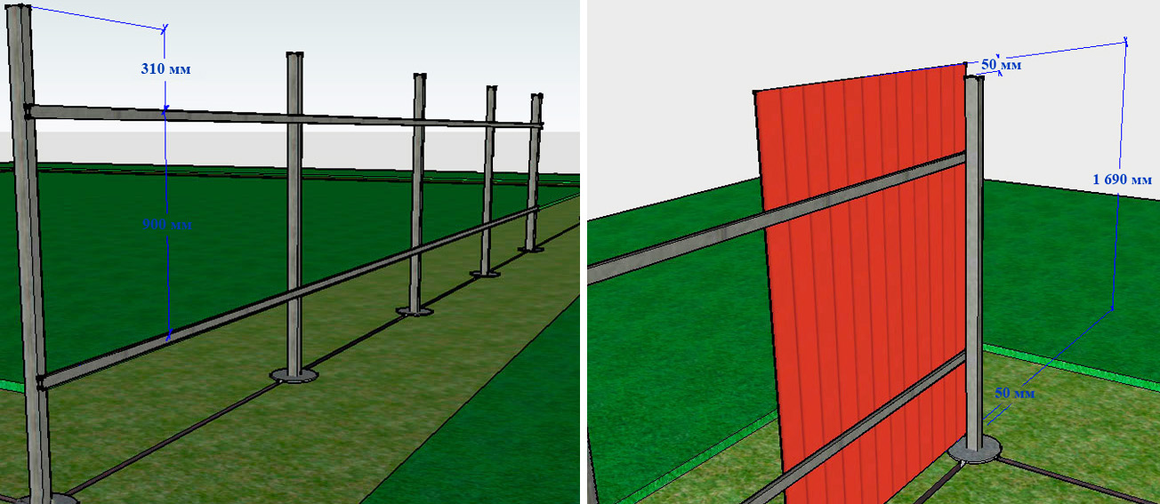 - Длину секций – для секционного забора. Она берется кратной 1, 1,5 или 2 листам профнастила.