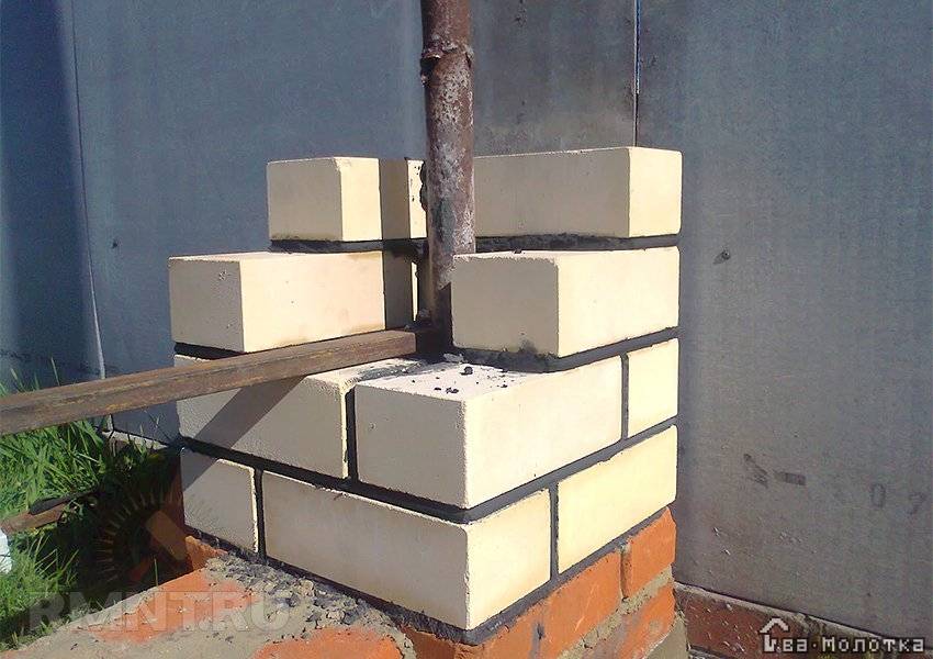 Дальше закладываются кирпичи. Весь процесс закладки нужно проверять строительным уровнем, чтобы избежать неровностей. Также можно использовать различные вспомогательные материалы, чтобы обеспечить ровную постройку. Например, палки и прутья, находящиеся от сердцевины до кирпичей. Столбы должны достигать 2 м в высоту.