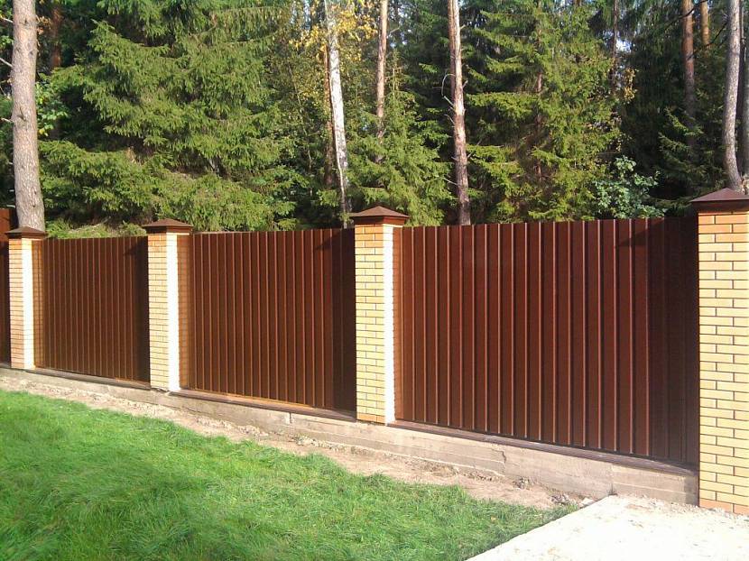 - заборы из кирпича с деревянными частями. На ленточном фундаменте располагают секции из евроштакетника, из профнастила;