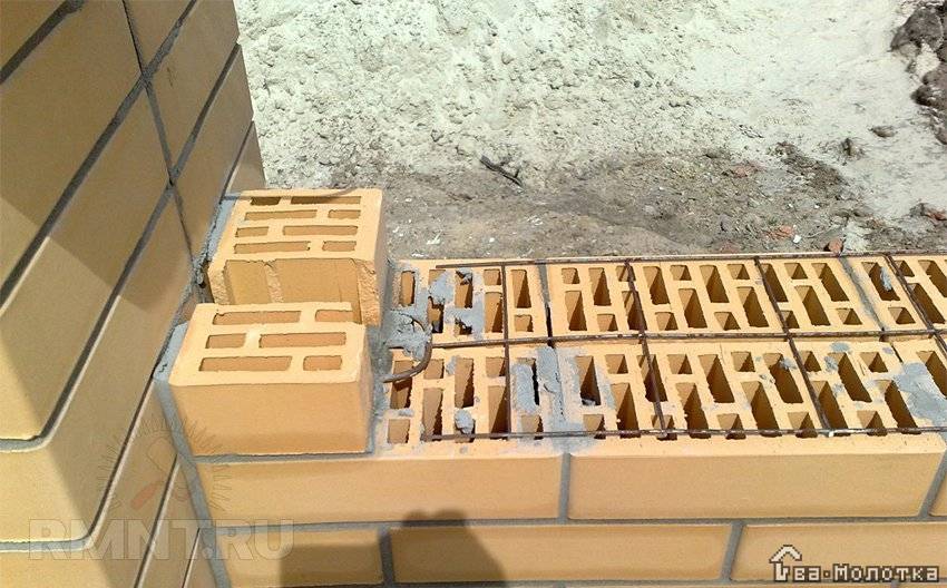 Рабочий элемент находится в швах кладки. Визуально торец стены просто подходит вплотную к столбу, и разбежка швов кладки обрывается ровно по его плоскости. Кладочная сетка, заранее вложенная в столб, заводится в швы стены. Этот способ всегда используется при работе с отделочным кирпичом.