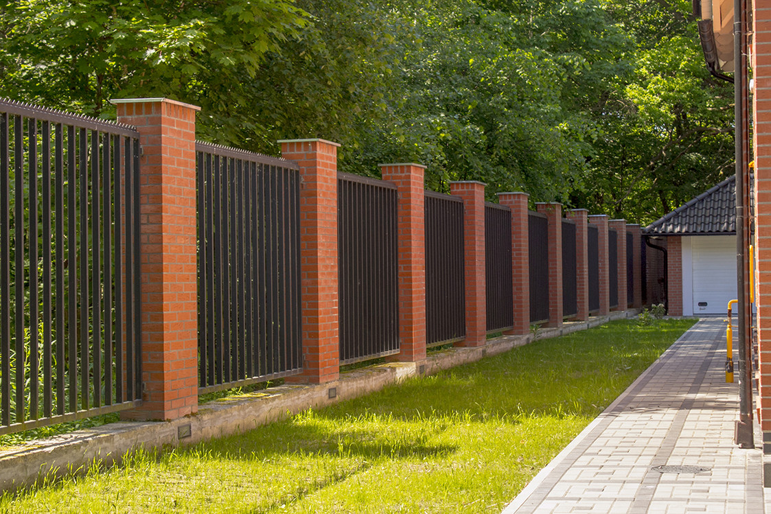 Столбы из кирпича будут выгодно смотреться как с деревянными секциями, так и с профнастилом. Если участок маленький, то забор с кирпичными столбами выйдет недорогим, но смотреться будет эффектно.