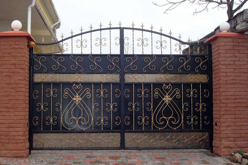 Зачастую полностью кованая изгородь не удовлетворяет хозяев ввиду того, что она не скрывает двор от посторонних глаз. Чтобы это исправить, можно заказать или изготовить самому комбинированный вариант ковки с профилированным металлическим настилом.