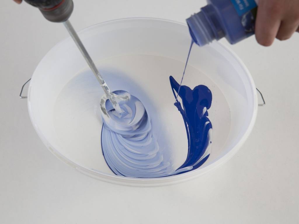 Объем колоранта в акриловых красках не должен превышать 8%. Количество капель в банке пропорционально количеству в пробнике. После добавления пигмента в белую основу состав тщательно перемешивают. Не стоит пользоваться подручными средствами и мешать заколерованную краску вручную, иначе цвет будет неравномерным. Для перемешивания используют дрель со специальными насадками или строительный миксер.