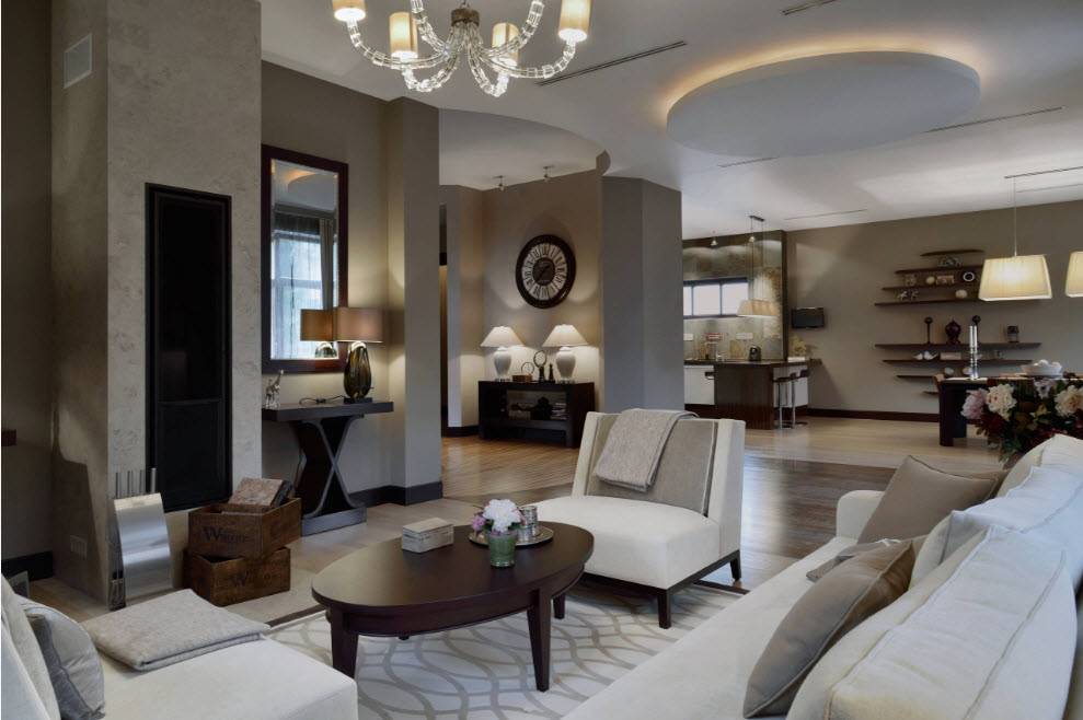 Во внутреннем убранстве будут органично смотреться антикварные вещицы, зеркала в массивных рамах и живопись. Фото интерьера загородного дома в классическом стиле: