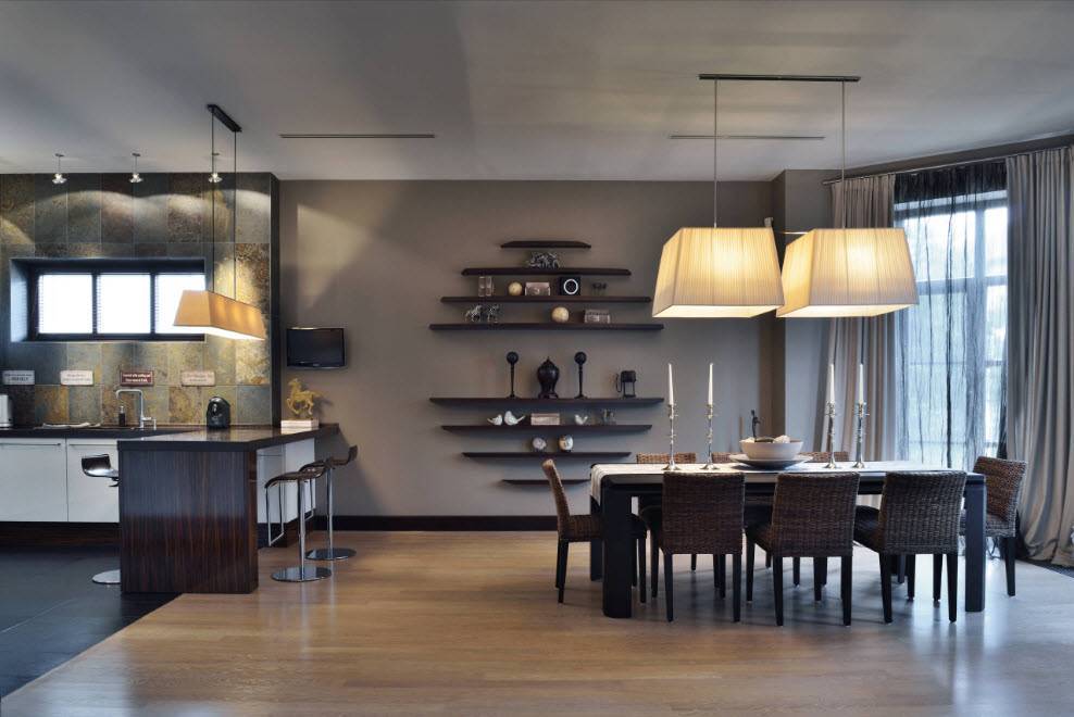 Яркими элементами роскошной лаконичной кухни без излишеств стали барная стойка, оригинальная композиция из полок, благородная отделка из камня а также пару элегантных бельгийских светильников над столовой зоной.