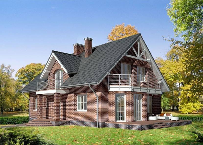 Большой загородный дом, фасад которого выполнен из облицовочного кирпичаИсточник lk-projekt.pl