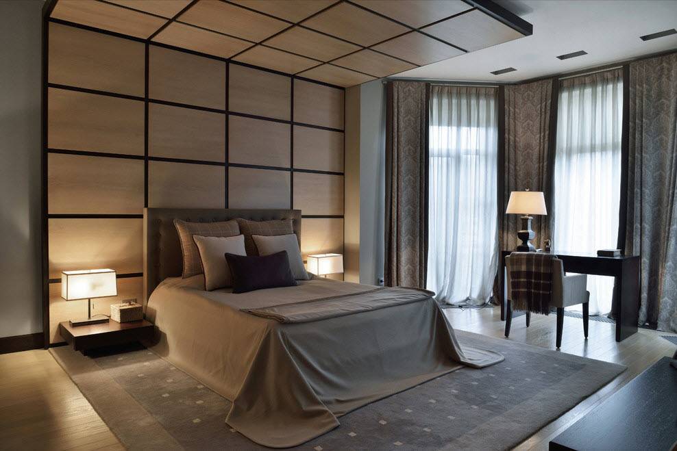 Заметным элементом в спальной комнате является конструкция из шпона, перетекающая со стены у изголовья кровати на потолок.