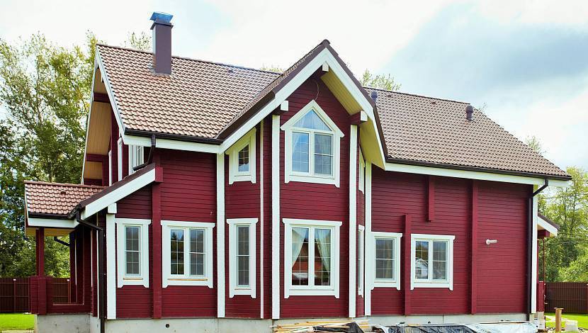 Каркасный дом с бордовым фасадом и стильными окнамиИсточник pokraska.stone-kotedj.ru