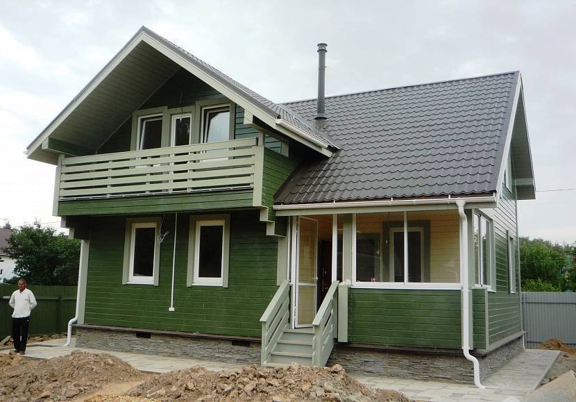 Зеленый каркасный дом с фронтоном и мансардойИсточник designcapital.ru