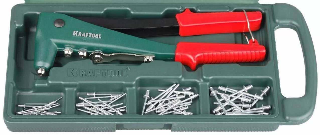 Инструмент полупрофессионального класса, хороший выбор для монтажа большого количества заклепок. Работает с алюминиевыми и стальными заклепками от 2,3 до 5 мм, снабжен пятью сменными головками. Обойдётся в 1560-1700 рублей.