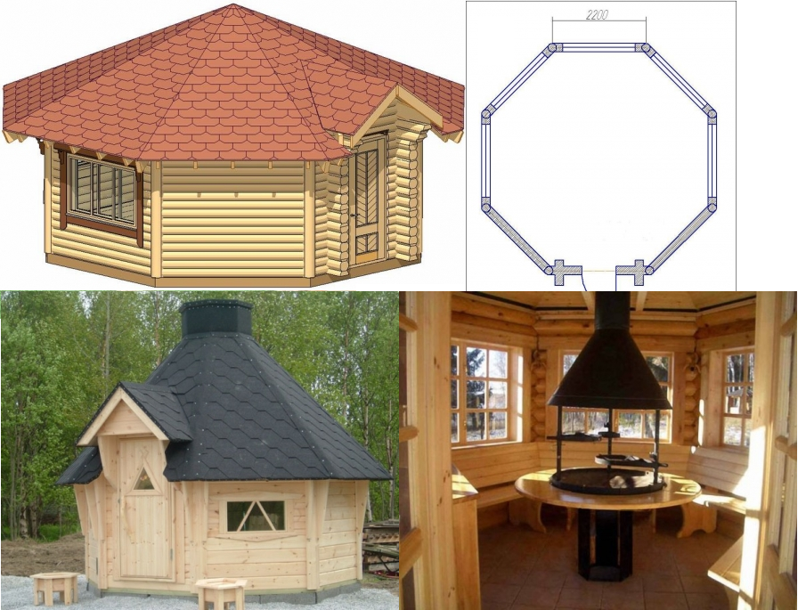 Такое строение будет радовать экологической безопасностью. Натуральные окраски и аромат древесины помогают оздоровлению организма. Здания из дерева гармонично сочетаются в единое целое с дизайном в стиле кантри. Но любое деревянное помещение с мангалом внутри обязательно должно соответствовать условиям повышенной пожаробезопасности.