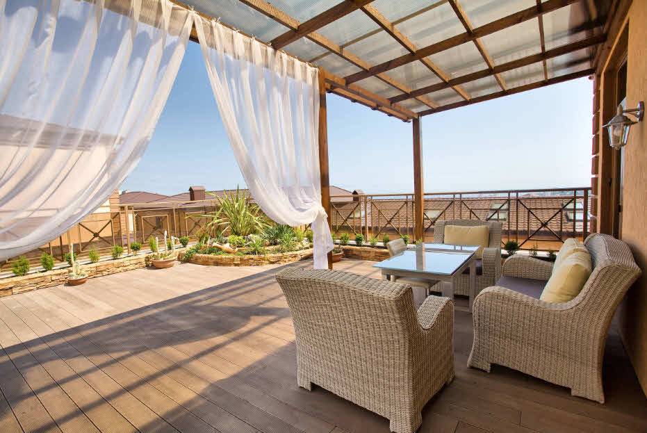 Из традиционных предметов мебели — это все. Могут еще использоваться полочки, которые вешают на стену здания. Если есть глухая торцовая стена, ее можно превратить в полку, на которой расставить все необходимые на отдыхе мелочи.