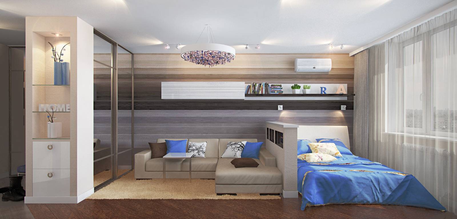 Естественным образом разделит комнату диван, поставленный спинкой к кровати. Если для шкафа в коридоре не нашлось свободного пространства, его можно поставить в спальной зоне напротив кровати. Для него можно выбрать зеркальные фасады, добавляющие визуального простора помещению. Угловое расположение шкафа выгоднее с точки зрения экономии площади.
