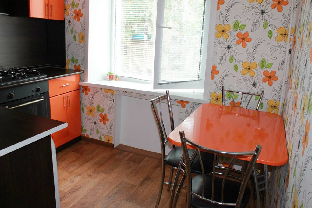 А теперь поговорим об отделке. Когда кухня экстремально мала, значение имеет даже то, как уложен пол и оформлены стены. Так, отделка пола широкими и длинными досками, а также облицовка стен обоями с большим и ярким принтом, «съест» и без того крохотное пространство. Зато правильная отделка поможет здорово его расширить.