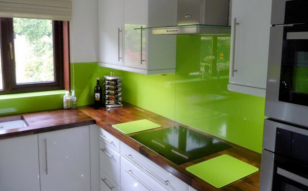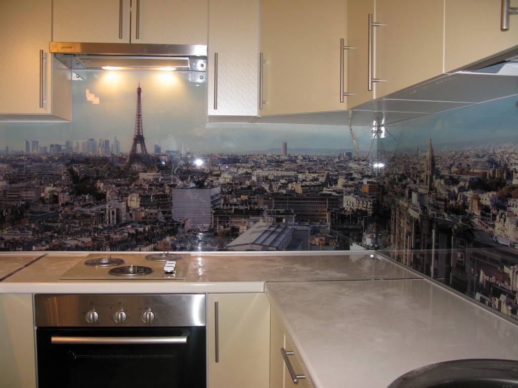Вдохнуть жизнь в монотонное белое убранство поможет фартук в технике скинали. Он представляет собой глянцевую пластину. На ее поверхность можно нанести любое изображение, гармонирующее с общим стилем кухни.