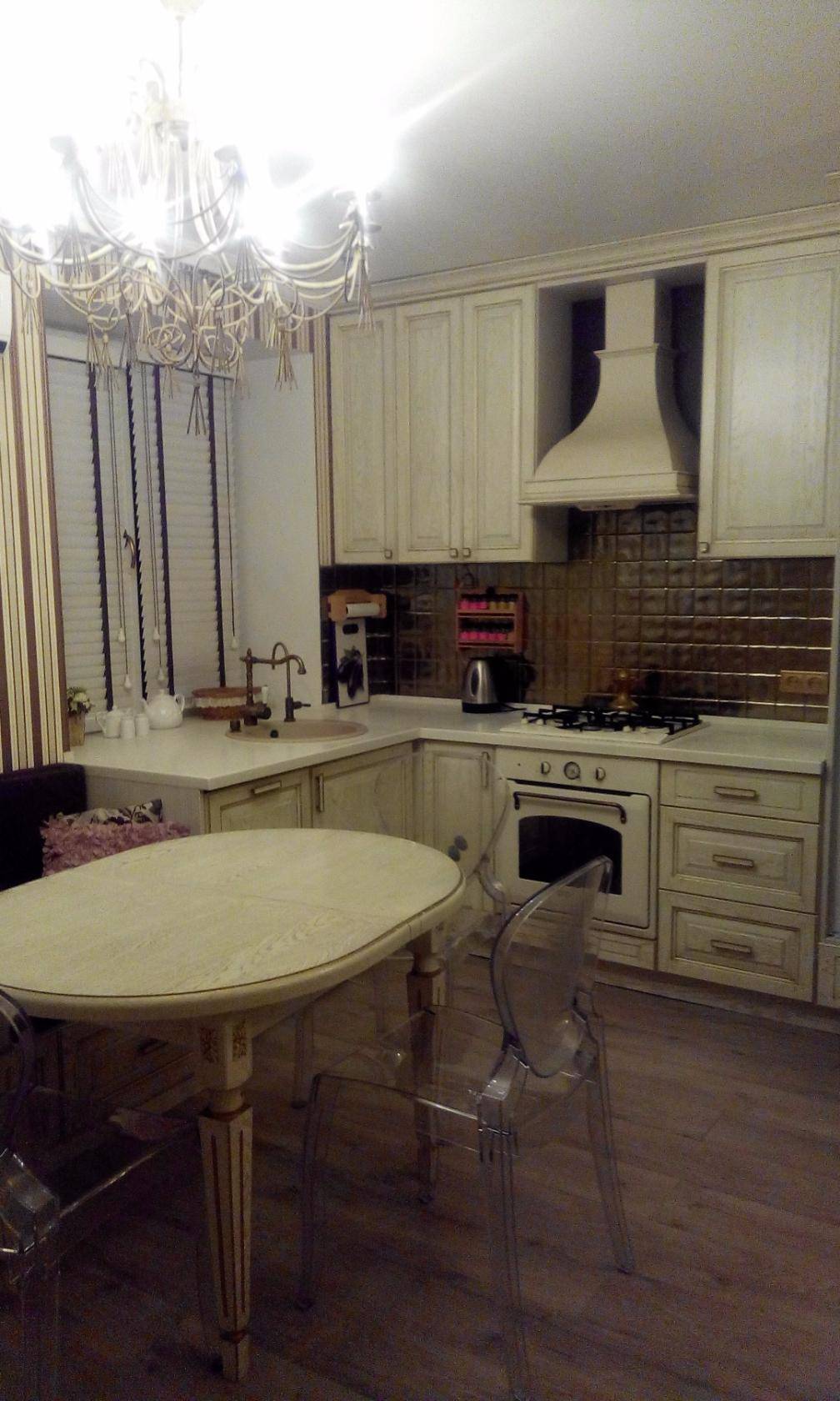 Классический стиль — неплохой вариант дизайна прямого помещения. Для его обустройства следует выбрать изящный гарнитур из натуральных материалов, за фасадами которого будет спрятана вся бытовая техника. Окна украсят легкие шторы, освещение создаст большая люстра, расположенная прямо над обеденным столом.