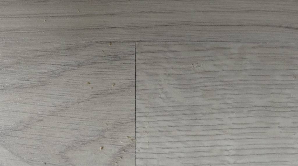 - У планки отсутствует угол в 90 градусов. Такой брак встречается. При сборке покрытия по торцевой части образуется щель, которую невозможно устранить. Даже максимально простучав, можно лишь частично убрать зазор. Он перераспределится между торцевой и длинной частью, став менее заметным.