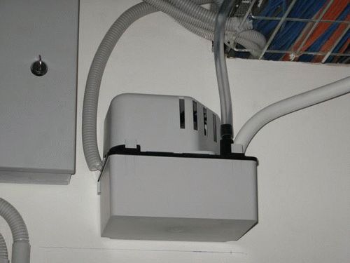 Такой насос оснащен собственным небольшим баком для сбора жидкости с уже установленным в нем прибором контроля уровня. Это устройство можно разместить в существующем поддоне кондиционера или на небольшом удалении от него с помощью гибкой трубки. Иногда его встраивают в имеющуюся штатную систему дренирования, которая не справляется со своей задачей.