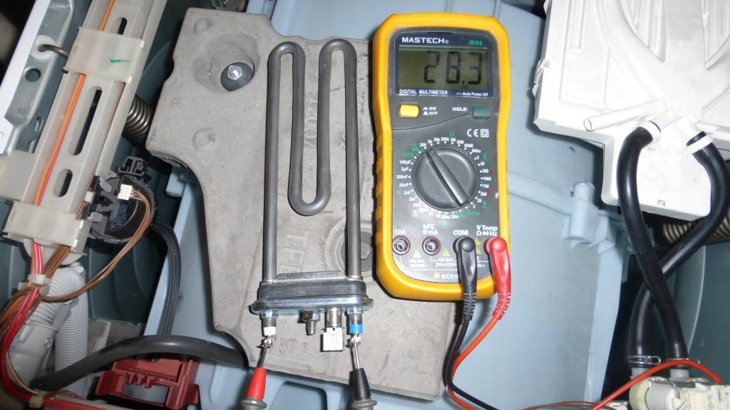 Если вы не уверены, что дело в нагревателе – протестируйте его мультиметром. Исправный ТЭН, мощностью 1800 Вт, должен выдавать сопротивление 25-28 Ом.