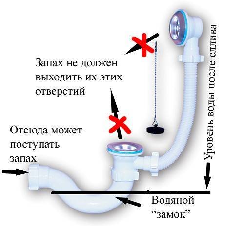 При срыве сифона также может появиться неприятный запах. В этом приборе задерживается вода, являющаяся пробкой между помещением и канализацией. Залповый сброс сточной жидкости по стояку приводит к срыву детали. При недостаточном диаметре вода наполняет сечение прохода, образуя пониженное давление, увлекающее жидкость из устройства за собой. Гидрозатвор уходит в трубу системы, позволяя вони проникнуть в дом.