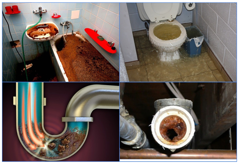 При засорах канализационные стоки не уходят в септик, а смешиваясь с чистой водой переполняют трубопровод и проникают в гидрозатворы. В итоге в унитазах и под сливными решетками раковин, моек, ванн, душевых кабин стоит грязная вода с неприятным запахом.