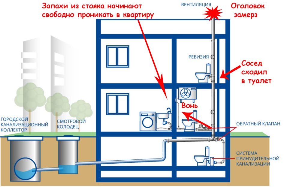 Падающий при смыве водный поток в стояке из-за разряжения воздуха затягивает воду из гидравлических затворов, в результате запах из канализации в отсутствии водяной пробки беспрепятственно попадает в помещения.