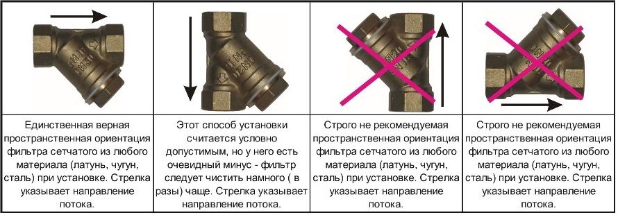 Существуют элементы с вертикальным и с косым направлением фильтрующей сетки. Корпус устройства располагается крышкой отстойника вниз, при ошибочном монтаже загрязнения не задерживаются сеткой и попадают в картридж тонкой фильтрации.