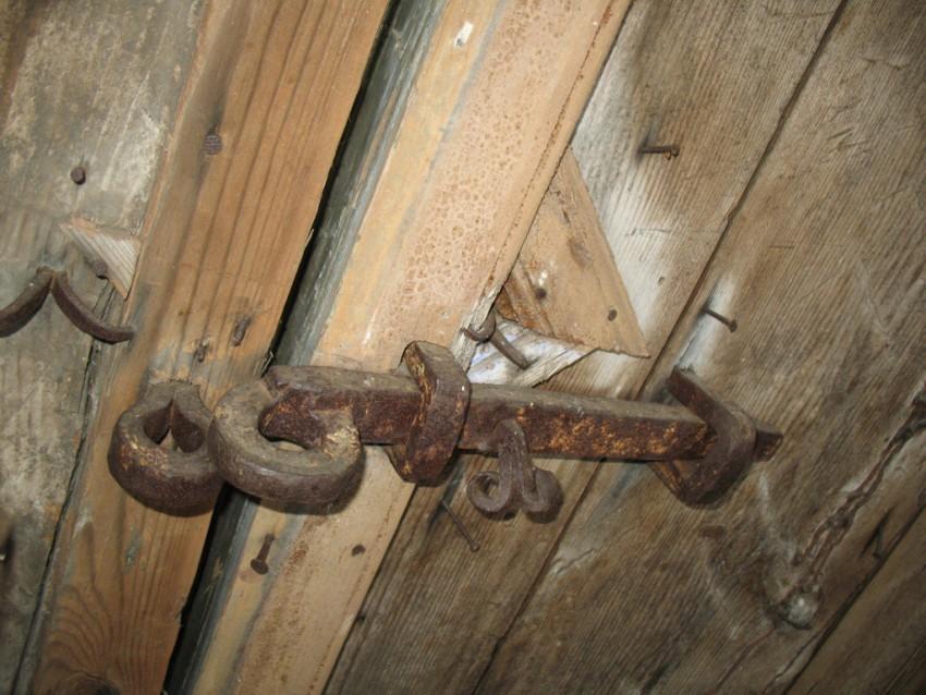 - Защёлка для откатных ворот откидного типа – работает за счёт 4 загнутых крюков и стальной пластины. Для производства можно использовать и дерево. Деревянный засов можно увидеть не только на воротах, но и на калитке.