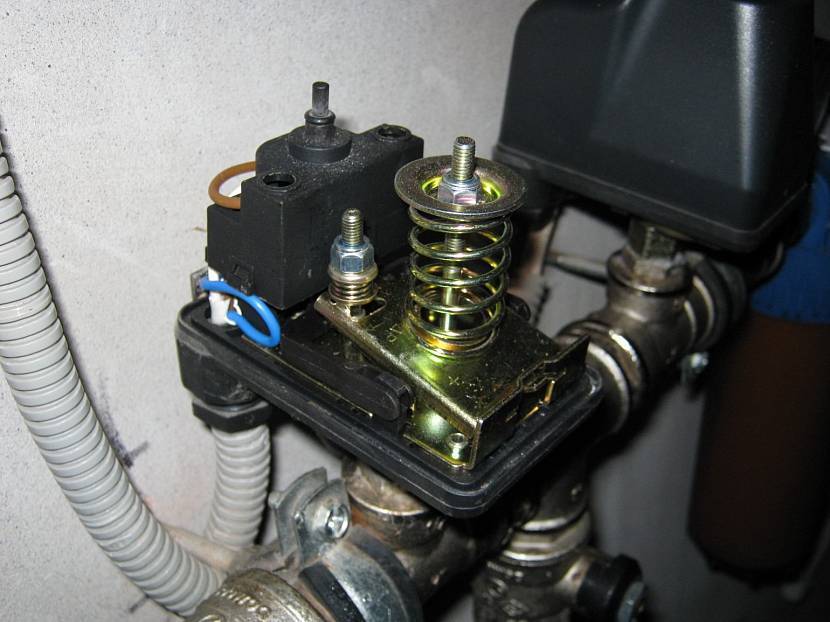 Защита от сухого хода насоса включается в зависимости от заданных пользователем показателей давления внутри системы. Чтобы задать параметры функционирования устройств, присутствует специальный регулировочный винт. Он соединяется с пружиной, которая изменяет силу натяжения при его повороте в определённую сторону. Именно при помощи винта пользователь задаёт показатели давления, при которых будет происходить размыкание электрических контактов и прекращение работы насоса.