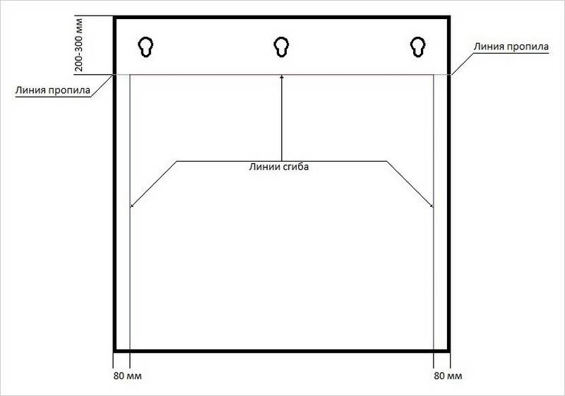 - Сделайте «выкройку». Отметьте по бокам 15 — 20 см и проведите линию под линейку. Это будущие боковые крылья. Они не дают расходиться холодному воздуху по комнате, поэтому делаются достаточно высокими.
